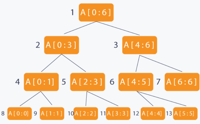 이를 구현하기 위하여 Segment tree를 아래와 같이 구현합니다.