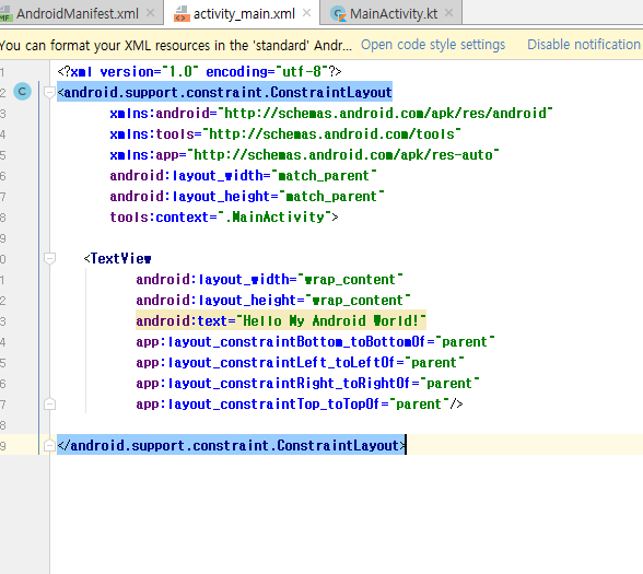 바꿔준 텍스트는 아래 R.layout.activity_main 에서 설정되는 setContentView 에 의해 화면에 표시될것이다.
