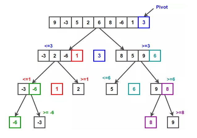 3) 이 과정을 Pivot 기준 왼쪽배열, 오른쪽 배열을 나누어 반복합니다. (배열을 더이상 나눌 수 없을 때 까지)